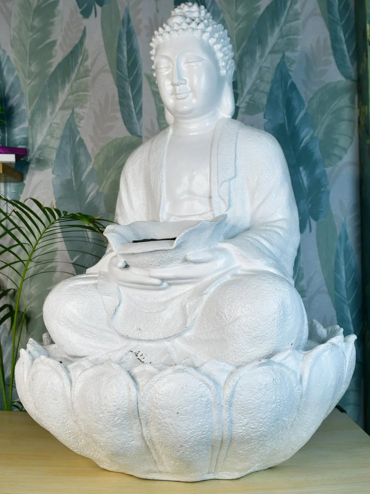 This Buddha Water Fountain, crafted from high-quality resin, measures 64 cm by 34.5 cm by 13.6 cm and features a serene white finish. Its elegant design with a sitting Buddha and cascading waterfall creates a tranquil atmosphere, perfect for enhancing home decor or as a thoughtful gift. To ensure optimal performance and longevity, clean the fountain and pump monthly, avoid direct sunlight, and maintain proper water levels to prevent damage and algae growth. This fountain combines aesthetic beauty with practical care for a lasting peaceful ambiance.