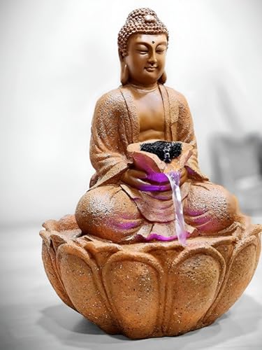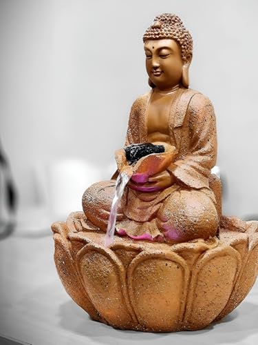 Swarnhouse LED Buddha Tabletop Water Fountain, 14 Inch, White Lotus Design, Indoor Decor (Design 2)